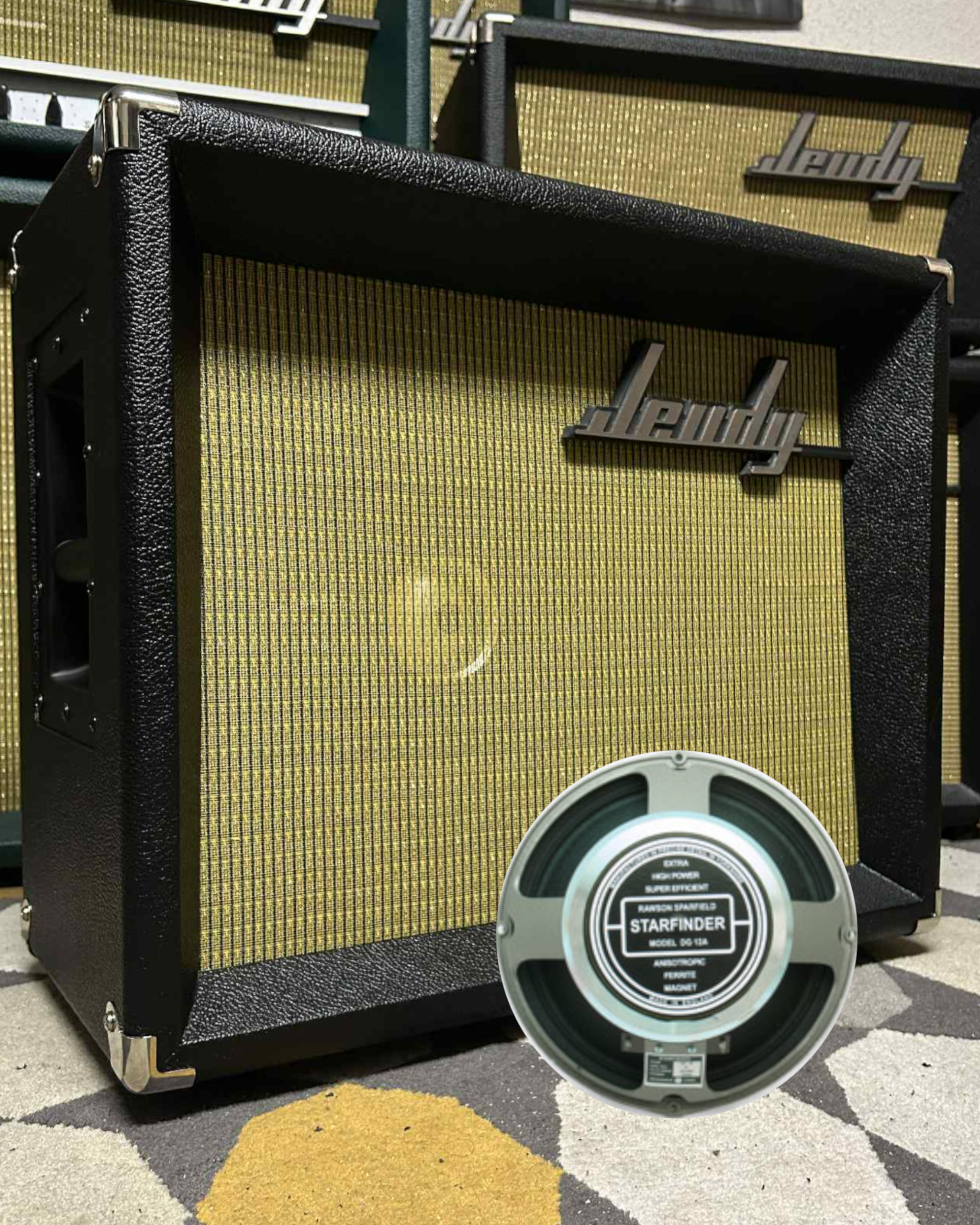 Ce modèle 112 est équipé d’un haut parleur fait mains en Angleterre par RAWSON SPARFIELD, Le tout nouveau haut-parleur pour guitare « Starfinder » DG12A en aluminium moulé de 100 W et 12 pouces, doté d’un aimant en ferrite anisotrope à très haute puissance, d’une bobine mobile de 2 pouces et d’une puissance de 20 000 gauss, a été minutieusement reproduit selon les mêmes spécifications que son prédécesseur, le « CRESCENDO » 12A, qui a joué un rôle déterminant dans la création du son unique des débuts des Floyd.